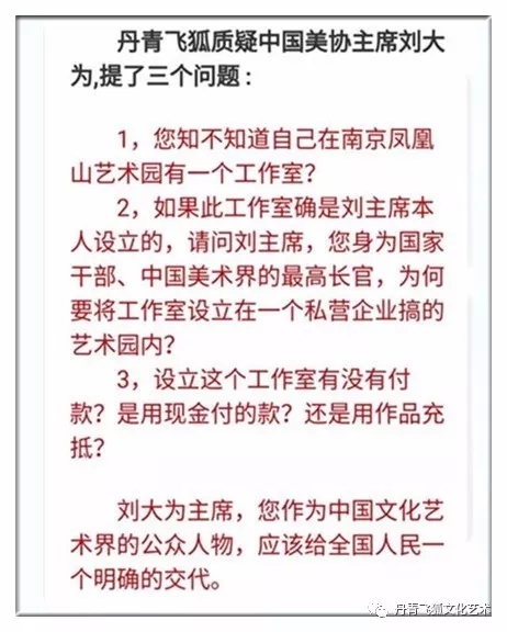 2014年10月30日,《丹青飞狐三问身价过亿的中国美协主席刘大为》一文,被“艺术**公众平台”转发,引爆媒体,一夜间,该文被国内外各界人士以不同标题疯传,在当天“全国微信公众帐号阅读榜”上,排名第一。
