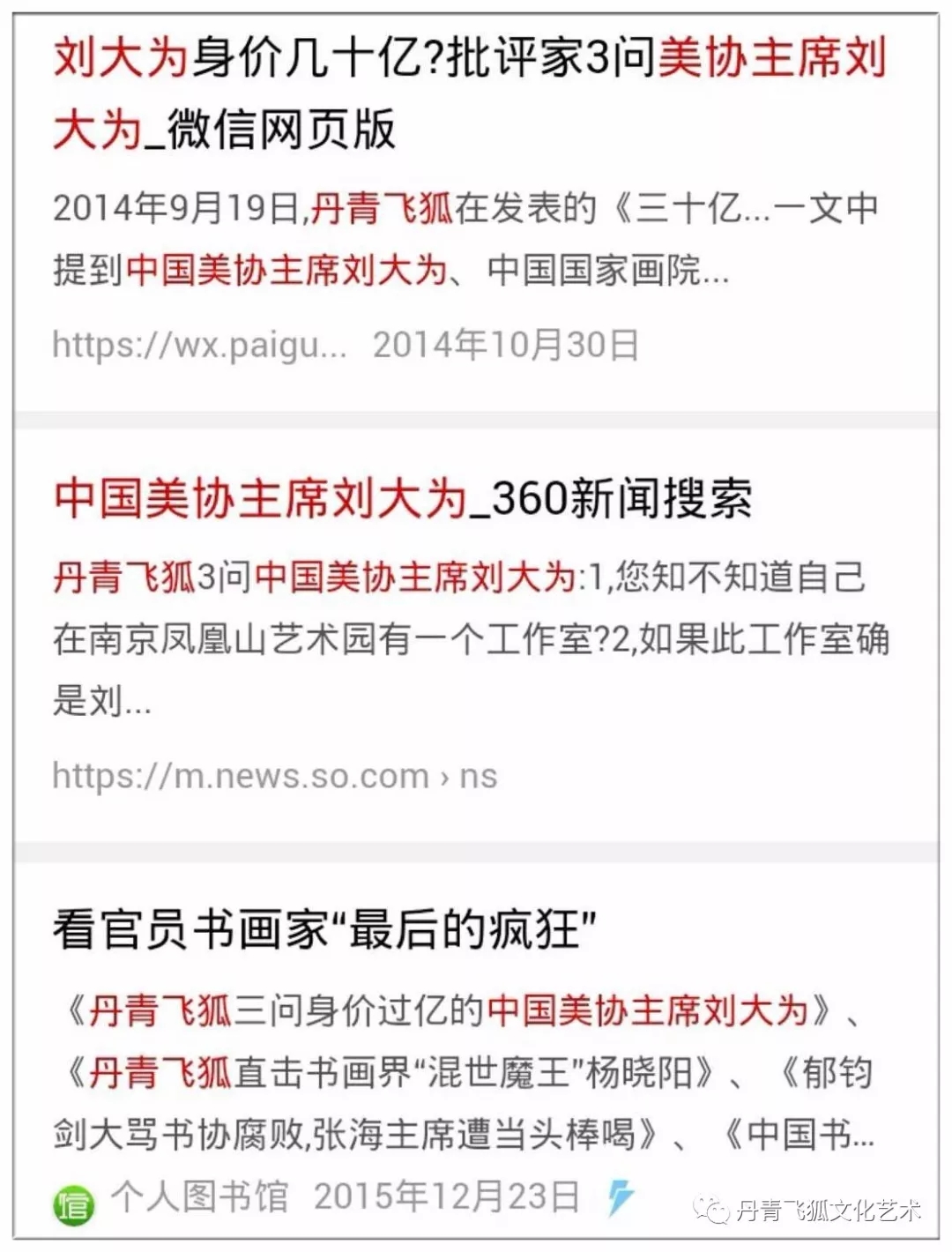 (图为《丹青飞狐三问身价过亿的中国美协主席刘大为》百度搜索部分页面截屏)