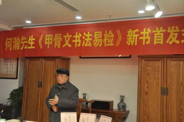 在热烈的气氛中,中国著名书画理论家郭因表达了对何瀚先生的祝贺和由衷的敬意,称《甲骨文书法易检》一书丰富了中国书法史,为甲骨文书法创作做出了突出贡献。张良勋先生是原安徽省书法 家协会主席与何瀚先生交往数十年,他热情赞扬了何瀚先生对书法孜孜不倦的攀登精神,他为人低调,不图名利,从不张扬,潜心学问,并谙熟书法理论,精通甲骨文和诗词楹联,当为后辈书法家学习的楷模。原省书协副主席陈建国对该书给予高度评价,称此书填补了我省甲骨文专著的空白,“何瀚不仅是学者的书法家,他本身就是一本书”。合肥市美协常务副主席兼秘书长王衍平呼吁大家学习何瀚先生严谨的治学精神。随后,安徽省作家协会副主席裴章传先生、著名书画家萧承震、刘燕凌、黄小舟、安徽大学教授王光汉先生盛赞《易检》新书社会影响力,给予作者良好的评价。