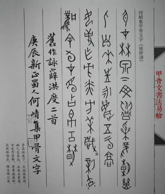 在我的印象中,生于1943年的何先生是一个热情而又谦和的人。抑乎是在意诗联工作,每次活动他总是积极参加,并提出自己的建议。同时又很尊重其它联家意见,一旦别人提出不同看法,他也从不固执已见,所以与大家相处的相当融洽。前不久在市场星报组织的一次“黉街杯全国征联”评选时,何瀚带了几本刚刚由合工大出版社出版的《甲骨文书法易检》一大册,让大家很是吃了一惊。我过去只知道他对诗词、楹联、书画艺术颇有造诣储备,是一个复合型的多面手。翻阅之后才知他的艺术修养是多方面的,尤其对金文、甲骨文用功最勤,在这本搜集了甲骨文字1829字类似字典的著作里,他花费掉了将近三十年时光去整理资料,最后又于2016至2018年两年的突击努力,“逐一辨析源流,一一亲手书写,委实不易”,他的学生、作家叶观澜为之所写的贺词,十分精准的点出这本书的特色。