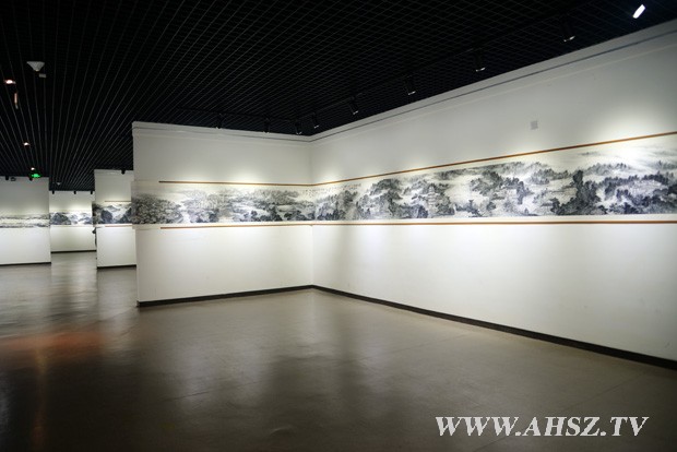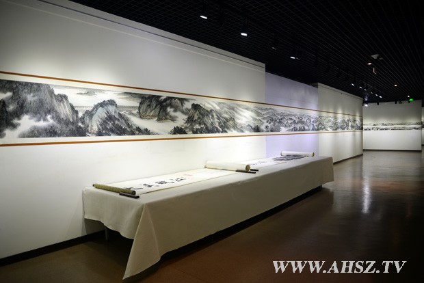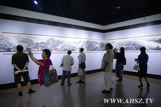 周庆介绍说,为贯彻落实省第九次党代会提出的建设美好安徽的重大部署,充分发挥文史研究馆在书画创作方面的引导作用,省政府参事室、省文史研究馆按照省政府打造传世精品的要求,组织70多位书画名家于2012年4月份启动了《“美好安徽”中国山水画长卷》采风创作活动,艺术家们深入全省各地采风,足迹遍布皖山徽水,于去年7月正式完成创作。“美好安徽”中国山水画长卷以新安江、八百里皖江、千里淮河、环巢湖为主线,突出表现皖南、江淮、皖北人文景观、自然风貌及城乡建设成就,其主要表现形式为中国传统国画青绿小写意,创作出《新安揽胜》、《大美皖江》、《淮河风情》、《湖舆胜境》四幅中国山水画长卷。