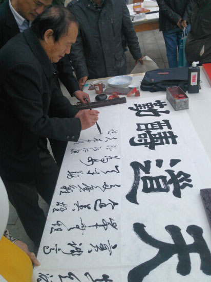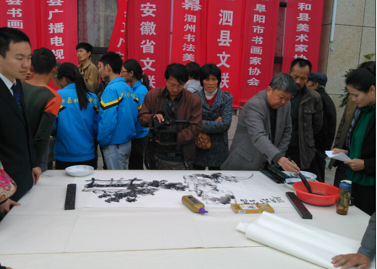 本场书画界的盛事,是由泗县金地花园房地产开发商出资赞助举办的。金地花园小区位于泗县东关开发区,公安局、泗州学校对面。凡在金地花园达成购房意向的,可以当场获赠名家书画作品。