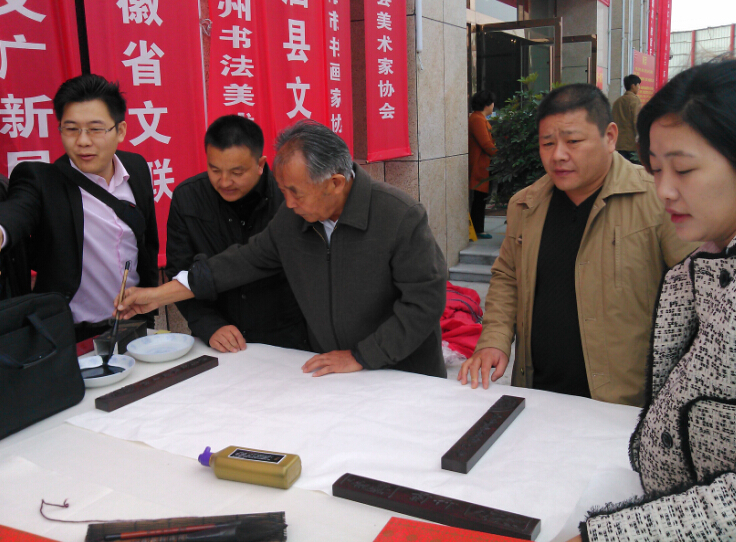 10月28日,古泗州书画名家作品邀请展在泗县东关金地花园售楼部隆重举办。来自盱眙、天长、宿迁、五河等地的近百名书画名家欢聚一堂,挥毫泼墨。