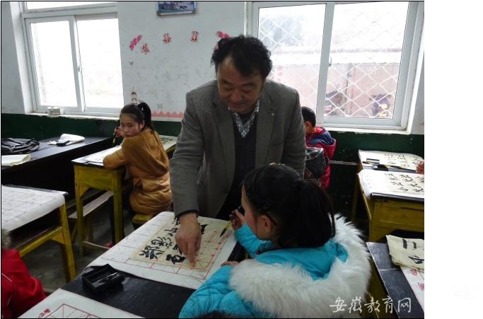(中国书法家协会会员、安徽省书法家协会理事、安徽省楷书专业委员会副主任;中国农工党安徽书画院副院长;宿州市书法家协会副主席兼秘书长;黄淮海书法家协会主席;中国书法之乡埇桥书协主席朱绍俭指导学生习字)