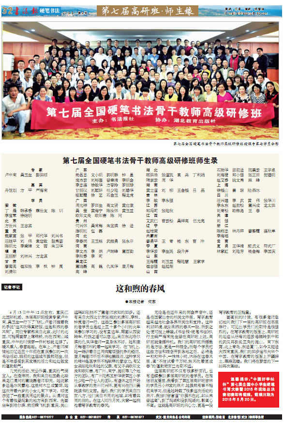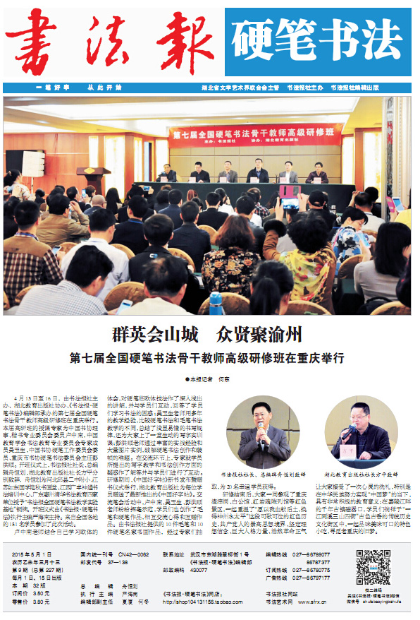 4月13日至16日,由书法报社主办、湖北教育出版社协办、《书法报·硬笔书法》编辑部承办的第七届全国硬笔书法骨干教师高级研修班在重庆举行。本届高研班的授课专家为中国书协理事、楷书专业委员会委员卢中南,中国教育学会书法教育专业委员会专家成员吴玉生,中国书协硬笔委员会委员、重庆市书协硬笔书法委员会主任彭洪顺。开班仪式上,书法报社社长、总编辑舟恒划、湖北教育出版社社长方平分别致辞,舟恒划为河北邱县二中附小、江苏如东国学艳秋书画堂、江西广丰神通书法培训中心、广东惠州清华书法教育四家单位授予书法报全国硬笔书法教学实验基地铜牌。开班仪式由《书法报·硬笔书法》执行主编严海南主持。来自全国各地的151名学员参加了此次活动。