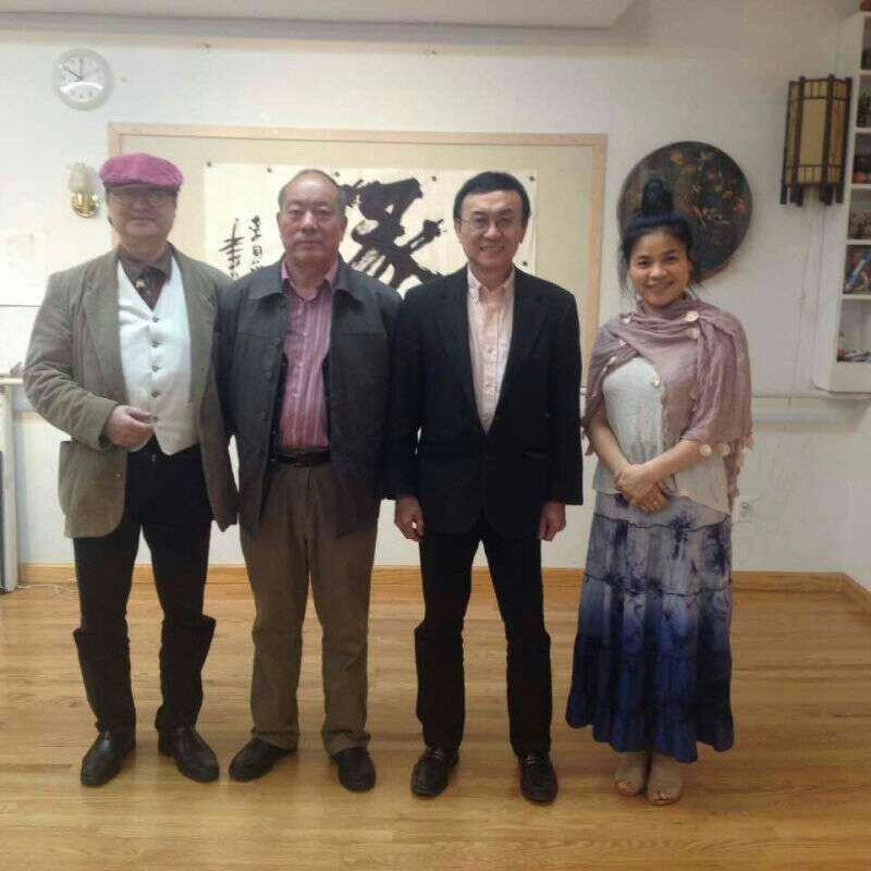 中国当代著名书法家沈鴻根,美国東西方艺术及文化促进会行政总裁羅芉樺,美籍华裔画家李同欣,张淙合影于纽约。