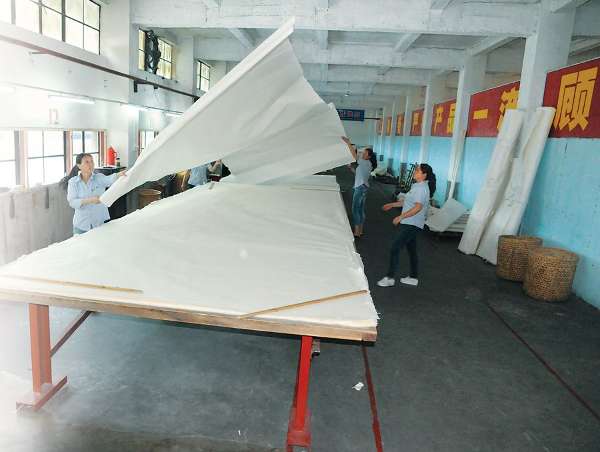 抄帘、跨转、抬手、弯腰、回身、落下……5月29日,在泾县中国宣纸股份公司宣纸生产车间水泥纸槽边,18名捞纸工人动作整齐划一,被誉为“宣纸之王”的特大型宣纸——“千禧宣”在这里恢复抄制,这也是该厂时隔15年后再次成功捞制特大型宣纸。