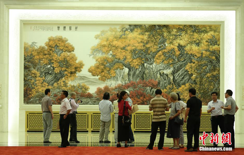 6月20日,人民大会堂布置创作的国画作品《胡杨礼赞》正式亮相金色大厅中央位置。该作品由中央文史研究馆研究员张介宇和陕西省中国画院专职画家张国宏父子合作完成。