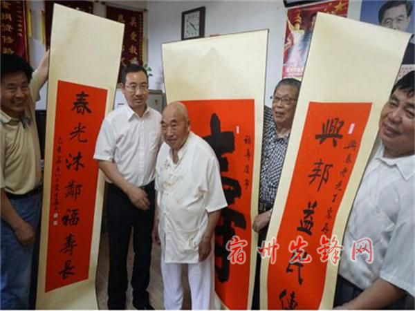 6月25日,埇桥区委常委、组织部长王思远和市老年书画协会常务副会长郭大华一行冒雨前往离休干部张兴春老人家中,亲切慰问这位88岁高龄有着71年党龄的老党员。