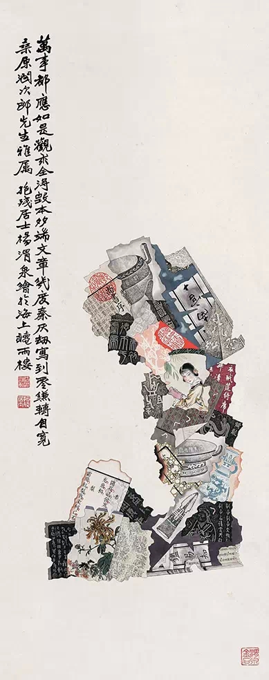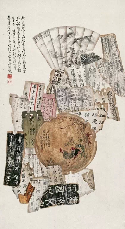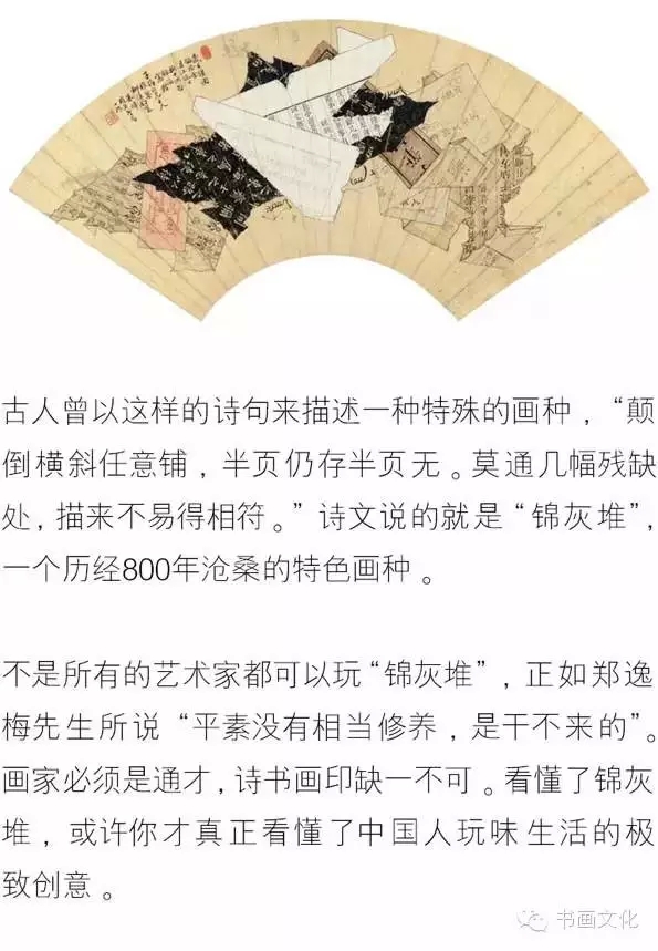 “锦灰堆”起初只是画家成画后对剩余笔墨的几笔游戏,通常是对书房一角的随意勾勒。翻开的字帖,废弃的画稿,参差的秃笔,杂乱无章层层叠叠挤入画纸。看去像是字纸篓打翻了,所以又叫"打翻字纸篓"。创作"锦灰堆",一般是在画纸上先框定轮廓,形状不拘、然后就着设计摹画若干重叠交错的小事物,诸如旧书的残页,揉皱的画幅,发黄的报纸,甚至门券邮票等等,只要上面有书有画即可,而且大多还是破烂的面貌,活像灰堆里拾出来的,这就是"锦灰堆"名称的由来。