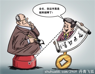 有些书协官员却凭着一点“书法技艺”,四处敛财,招摇撞骗。这些人顶着政府文化官员的头衔,戴着大师的桂冠,剪彩、颁奖、当评委、上讲台、到处走穴。他们耀武扬威、招摇过市,用粗制滥造的作品行销市场,误导审美取向,集聚个人财富。