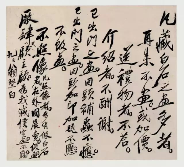 齐白石为人谦和,但自定的稿费标准却绝无商讨的余地。一句话,他定的润例,他说多少就是多少。什么事儿都好说,只是这事儿没商量。他家的客厅,挂着他亲笔书写的稿费标准,明码标价,一清二楚。给多少钱,画多少画,执行起来毫不含糊。有人为求一幅画,专程去拜访他,一进客厅,抬头就看见了稿费标准明细表,数数自己荷包里的钱,只够买一只半虾。小心翼翼说明来意,希望能得到齐白石亲笔画的两只虾。齐白石说:“我一生受苦,从童年至今,所以钱对我来说是很重要的。没钱,怎么生活呢?”然后接过钱说:“放心,一定让你满意。”随后,挥笔作画。先画了一只正在水边嬉戏的虾,活灵活现,美不胜收。之后,在这只虾旁边,画了一只在水面上只露出上半身的虾,下半身被层层水波挡住,惟妙惟肖。来客一看,非常满意。两个人皆大欢喜,都很开心。齐白石就这样巧妙地满足了来客的要求,同时又严格遵守了自己拟定的稿费标准。