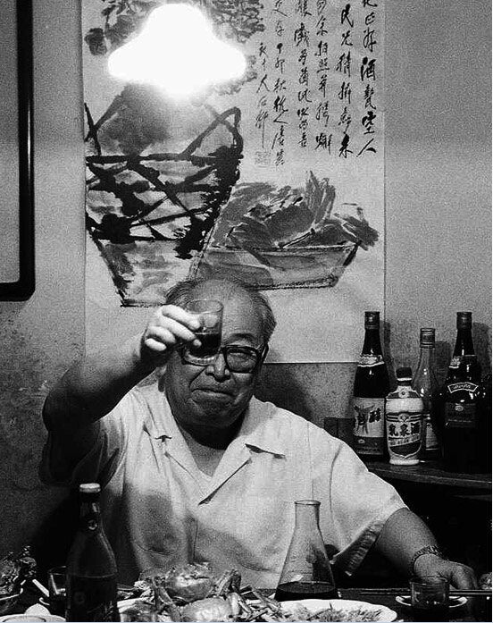 唐云先生饮酒海量、喜吃螃蟹。蔡斯民特意托人买了大螃蟹。唐先生一见螃蟹,灵感勃发,顺手画了一幅螃蟹、酒罐和秋菊。举杯畅饮,三杯下怀后,蔡斯民才启动快门,捕捉到了这幅传神之作。