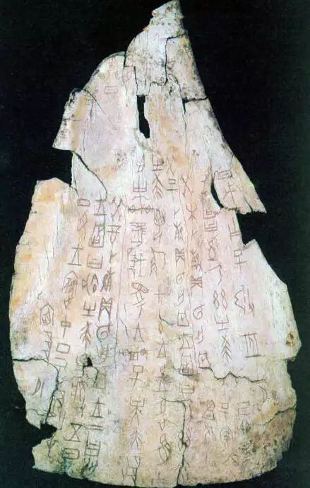 此骨系河南安阳出土,长32.2厘米,宽19.8厘米。是甲骨文断代第一期商武王时期的一块牛胛骨版记事刻辞。骨版巨大且完整,正反两面共有一百六十余字,背面字内填朱,色彩炫丽,内容为商代社会生活和天气等方面情况,有重要的文史价值。字体瘦硬劲直,工整端严。风格豪放,字形大小错落,生动有致,各尽其态,富有变化而又自然潇洒。不愧为甲骨文书法中的杰作。