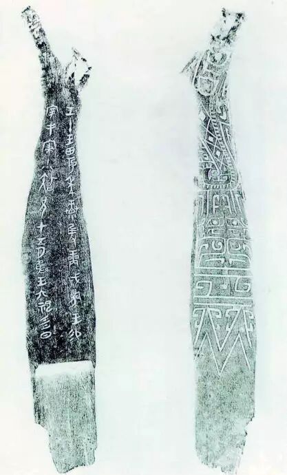 春秋时期兵器。1976年河南省辉县出土。通长53.8cm,格宽5.5cm。台北古越阁藏,