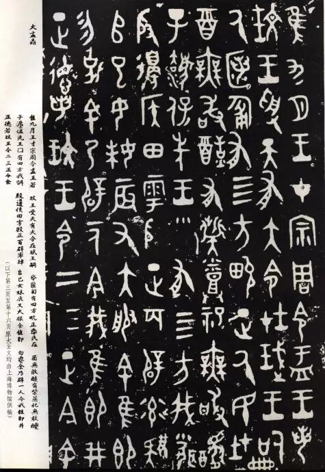 大盂鼎铭文内壁有铭文二百九十一字。其内容为:周王告诫盂(人名),殷代以酗酒而亡,周代则忌酒而兴,命盂一定要尽力地辅佐他,敬承文王,武王的德政。其书法体势严谨,字形,布局都十分质朴平实,用笔方圆兼备,具有端严凝重的艺术效果。开《张迁碑》、《龙门造像》之先河。以书法成就而言,大盂鼎在成康时代当据首位,是西周早期金文书法的代表作。