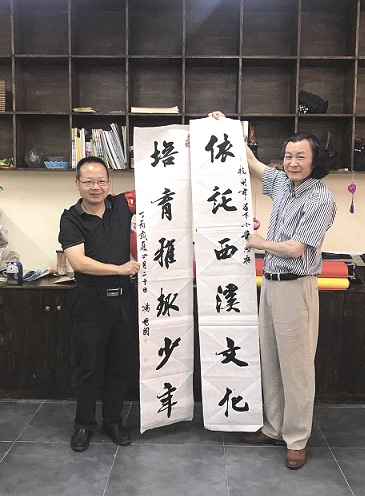 最后,杨老师在学校的书画社写下“依托西溪文化,培育雅趣少年”书法对联一幅,期待通过这次系列讲座,使得全体语文教师都能掌握这种科学的写字教育方法与教法,并为留下小学的写字教育做好坚实的后盾。