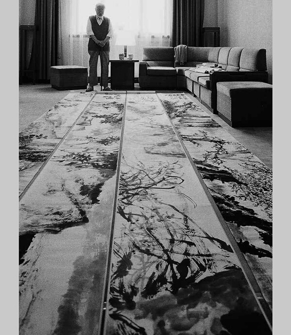 朱屺瞻在上海准备展出的四副巨构《梅兰秋菊》。蔡斯民特意租了静安宾馆一间大套间,画全铺在地上,让他站在一端,背光,拍下一张对比强烈的照片。