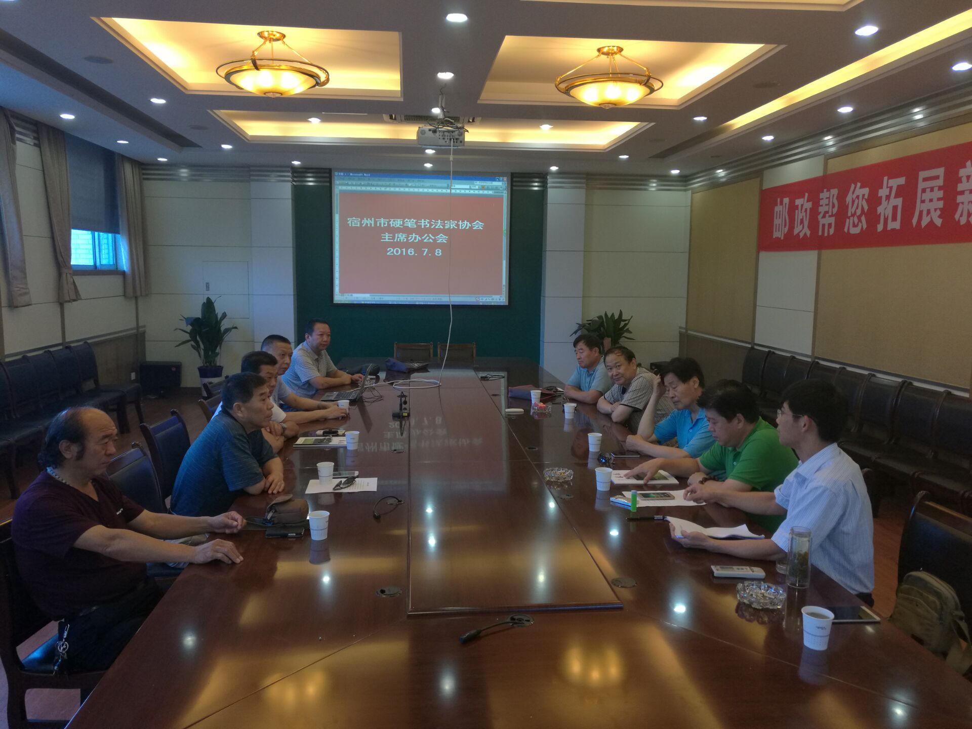 2016年7月8日下午,宿州市硬笔书法家协会在市邮政信函广告分局会议室召开主席办公会,除三名副主席请假外其他副主席全部出席会议。会议由副主席兼秘书长李明主持。主席王茂章参加会议并就近期工作做了周密安排。